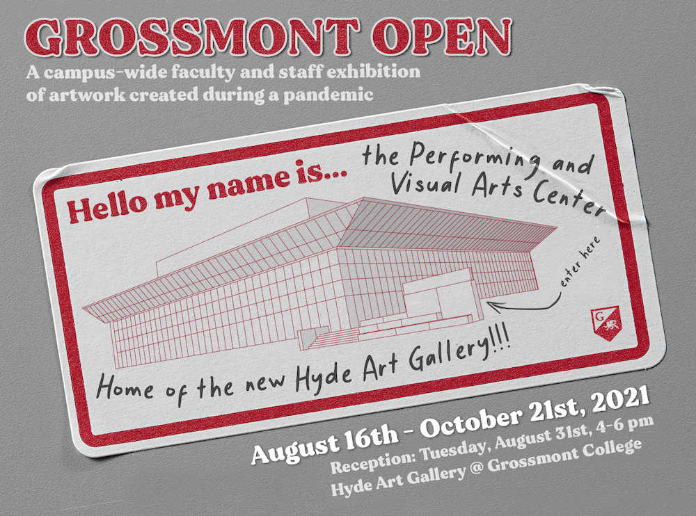 Hyde Art Gallery invites you to an open house reception for our newest exhibition, the GROSSMONT OPEN! Join us on Tuesday, August 31st from 4:00 - 6:00pm to view some of the artistic endeavors Grossmont College Faculty and Staff have accomplished while working remotely. This is the first in-person exhibition in our brand-new space in Grossmont College's beautiful Performing and Visual Arts Center.