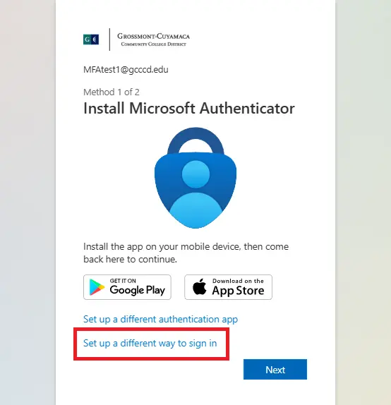 Choose Next on the screen that reads Let's keep your account secure. If you are asked to download and set up an app, look instead for an option reading Set up a different way to sign in: