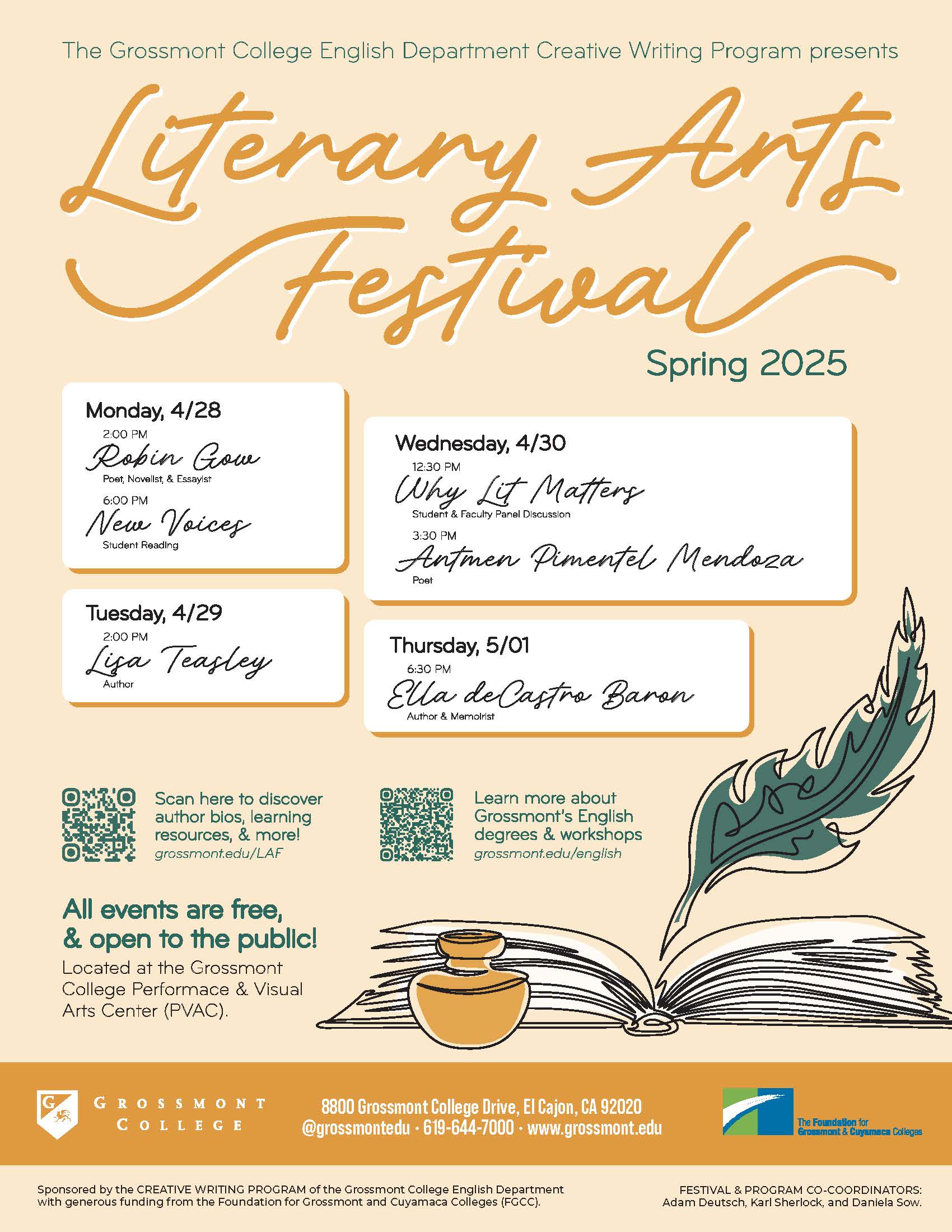 For more complete event details and author bios, visit our official FRS page or click the banner above. All events are free of charge and open to the public, and will be held on the Grossmont College campus in Griffin Gate (unless noted otherwise).