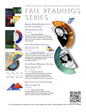 The Creative Writing Program's annual Fall Reading Series presents a season of events celebrating literature, showcasing award-winning authors, and honoring the inspiration to write. Free of charge and open to the public, our events are generously underwritten by the Grossmont College English Department, the GC Academic Affairs Symposium and Lecture Fund, and the Foundation for Grossmont and Cuyamaca Colleges (FGCC) Creative Writing Fund. Please consider visiting the FGCC Creative Writing Fund to make a tax deductible contribution that will help us continue bringing literary excellence to our students and community. Thank you!