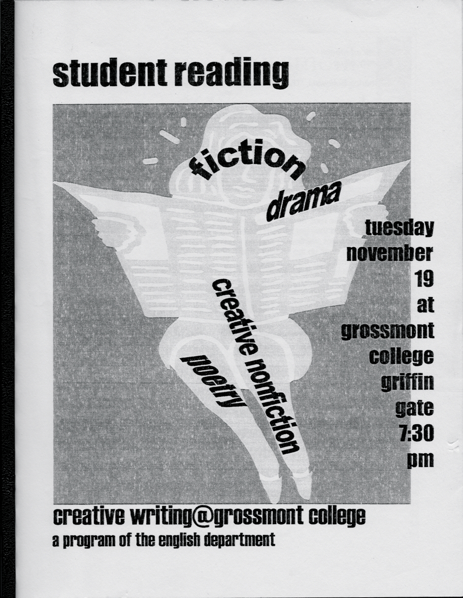 The annual Fall Reading Series (a.k.a., Fall Authors Series) presents a season of events celebrating literature, showcasing award-winning authors, and honoring the inspiration to write. Events are sponsored by the English Department and Creative Writing Program of Grossmont College, as well as a variety of other campus agencies and programs.