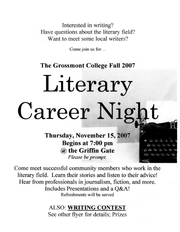 The annual Fall Reading Series (a.k.a., Fall Authors Series) presents a season of events celebrating literature, showcasing award-winning authors, and honoring the inspiration to write. Events are sponsored by the English Department and Creative Writing Program of Grossmont College, as well as a variety of other campus agencies and programs.