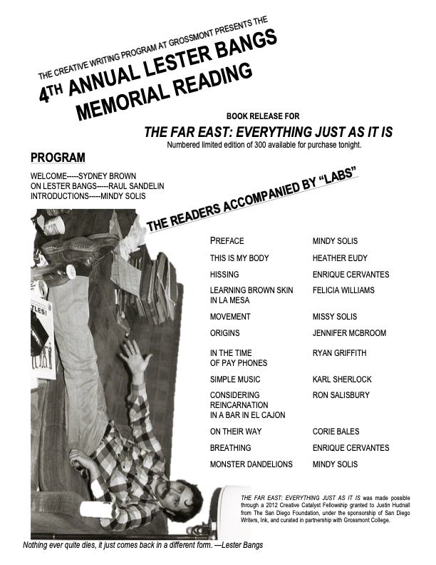 Proceeds go to the Grossmont College Creative Writing Program’s fall and spring literary events--always free and open to the public. Look for pledge sheets and posters soon.