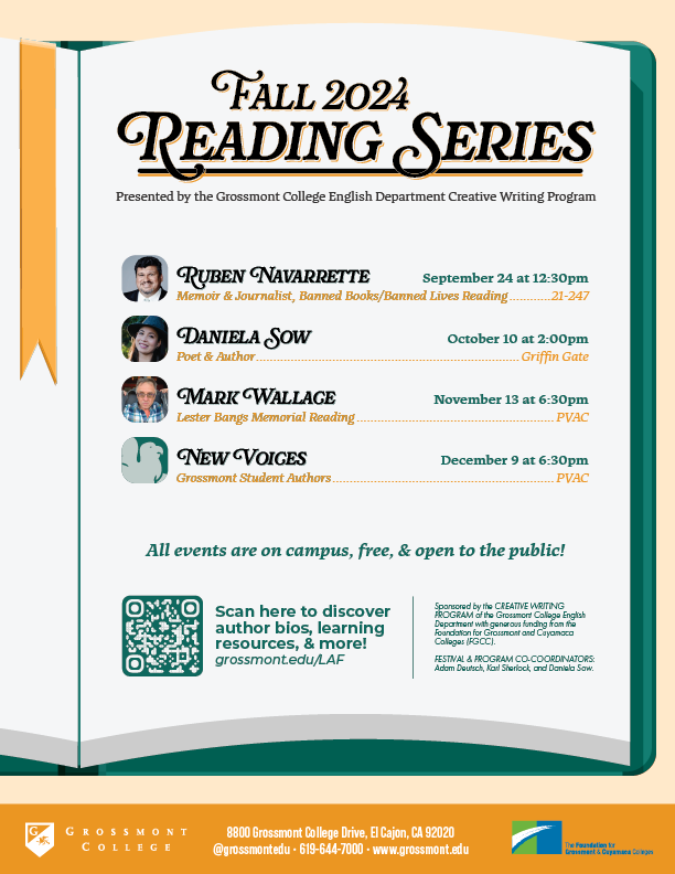 The Creative Writing Program's annual Fall Reading Series presents a season of events celebrating literature, showcasing award-winning authors, and honoring the inspiration to write. Free of charge and open to the public, our events are generously underwritten by the Grossmont College English Department, the GC Academic Affairs Symposium and Lecture Fund, and the Foundation for Grossmont and Cuyamaca Colleges (FGCC) Creative Writing Fund. Please consider visiting the FGCC Creative Writing Fund to make a tax deductible contribution that will help us continue bringing literary excellence to our students and community. Thank you!