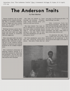 Playwright and fiction writer VERENA ANDERSON was a dedicated part-time instructor who was the progenitor for FirstDraft magazine, the predecessor of Acorn Review Literary Journal. |