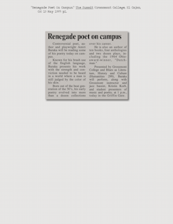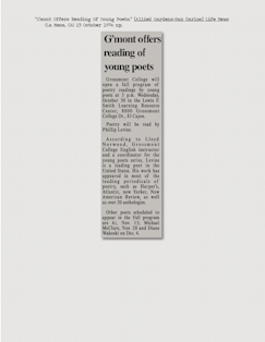 His tenure lasted only a few years, but poet LLOYD NORWOOD was an active part of the San Diego literary scene in his time and primarily responsible in 1974 for creating our first fall semester readings series, which featured writers and poets Ai, Michael McClure, Diane Wakoski, W. S. Merwin, Carl Rakosi, Sherril Jaffe, and future U.S. Poet Laureate, Philip Levine. |