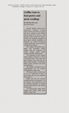 Poet, playwright, novelist, fiction writer, author KAMLA "KAMAL" KAPUR taught Creative Writing and forged the first drama writing workshops for the Creative Writing Program. Kapur is internationally recognized and, in India, highly acclaimed for her writings and plays. |