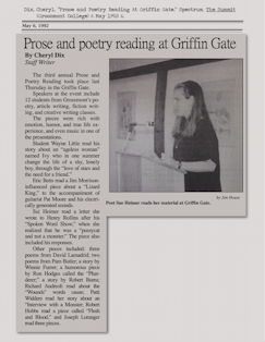Poet, Creative Writing instructor, and beloved colleague, JUDY BARKLEY was an editor and production assistant for Cowles Mountain Journal, which showcased the poetry, fiction, and literary nonfiction of California community college faculty. |
