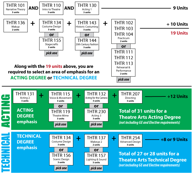 The Associate in Arts in Theatre Arts for Transfer (A.A.-T) degree is designed to facilitate transfer to a California State University in keeping with SB 1440. A total of 18 units are required to fulfill the major portion of this degree. Students must also complete the California State University (CSU) General Education Breadth requirements or the Intersegmental General Education Transfer Curriculum (IGETC) for CSU requirements (see the “General Education Requirements and Transfer Information” section of the catalog). Students should speak with a counselor to verity that the requirements for this degree have been met. In addition, students planning to transfer to SDSU should consult with a counselor.