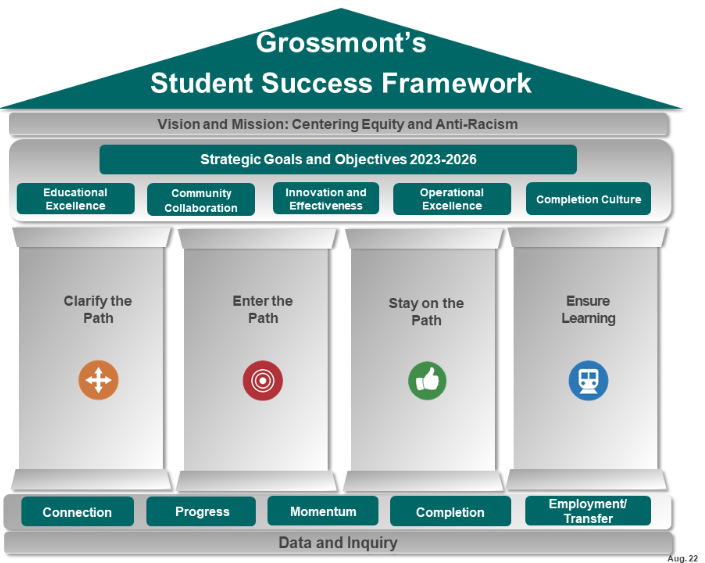 Vision: Empowered through a culture of inclusivity, Grossmont College strives to maintain our student-centered philosophy while working to support the ever-changing needs of our students. Along with ensuring student success, Grossmont College continues to advance our anti-racism and equity work as we venture further into the 21st century.