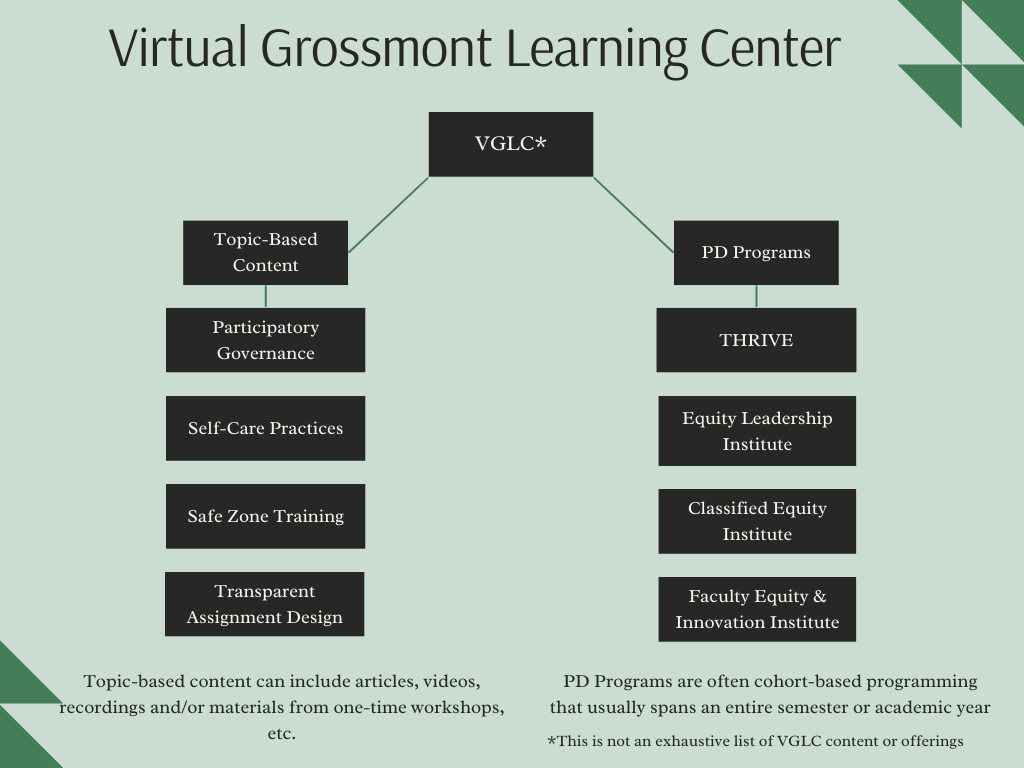 The Office of Professional Development is excited to announce the launch of our Virtual Grossmont Learning Center! The VGLC is a professional development resource that is open to all employees at Grossmont College. To learn more about the VGLC click through the tabs below.