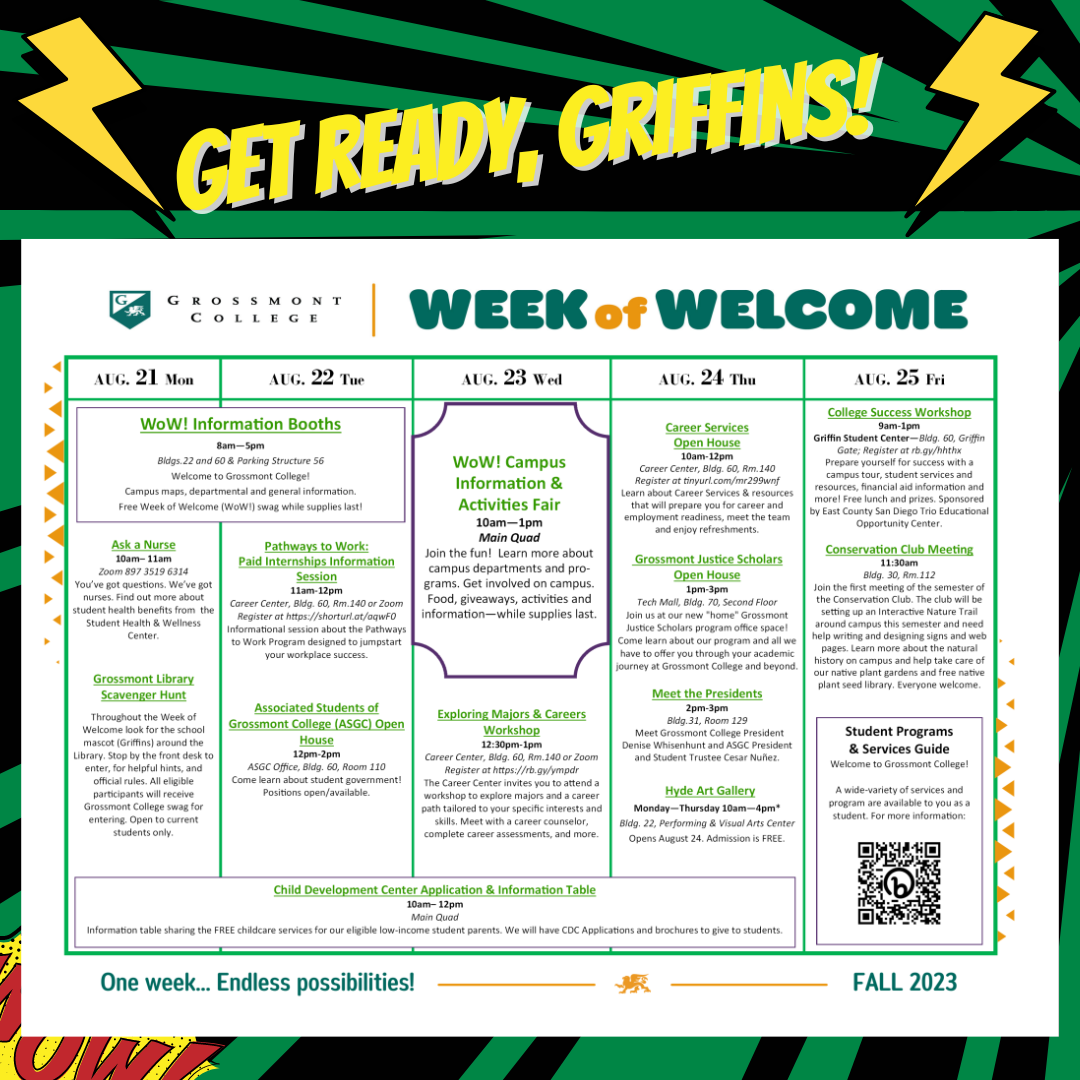 The Week of Welcome takes place during the first week of classes during the fall and spring semesters. During the Week of Welcome, campus departments and programs host open houses, information sessions, and other events. During the COVID-19 pandemic, all activities will take place virtually.