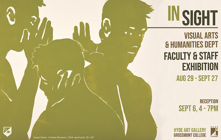 The Hyde Art Gallery is excited to launch the Fall 2022 semester with IN•SIGHT, the Visual Arts and Humanities Department Faculty and Staff Exhibition. This exhibition will showcase artwork produced by the arts educators here at Grossmont College and provide students, colleagues, and campus visitors with a glimpse into the creative and professional work being created by the faculty and staff within the Art Department. Featuring a diverse range of media, this exhibit also represents the various disciplines taught within Grossmont College's art programs including ceramics, digital media, drawing, jewelry design, painting, photography, printmaking, and sculpture.