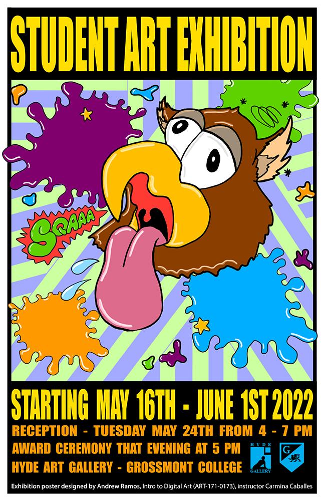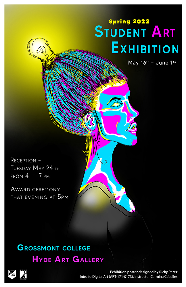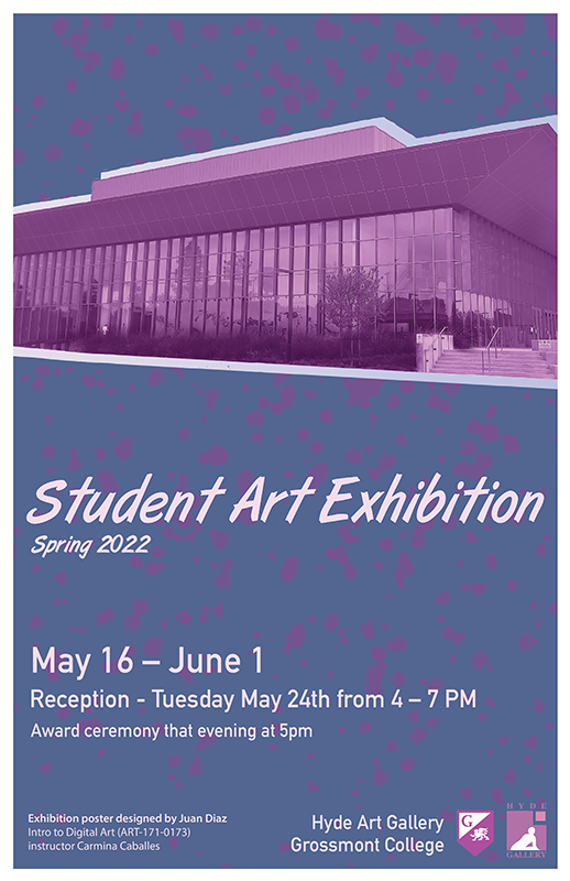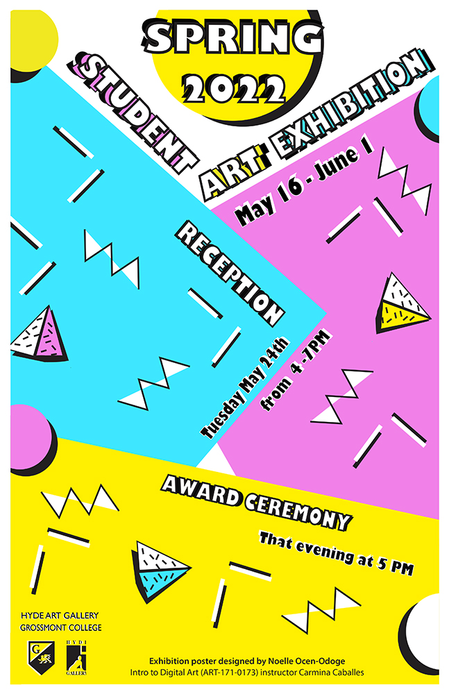 The Hyde Art Gallery is thrilled to reopen its doors on Monday, May 16th at 10am for our Spring 2022 Student Art Exhibition. Every year the gallery invites regional and national artists to Grossmont College for exhibitions, workshops, and lectures which supplement the educational opportunities for our diverse student population, faculty and staff, while also engaging the entire San Diego region. However the gallery reserves the final exhibition slot each semester for a curated showcase of student artwork. This recurring exhibition highlights the most exciting and innovative art and design projects that Grossmont College students produced during that particular semester including ceramics, sculpture, painting, drawing, jewelry, digital media, and photography. Student artworks on display are also available for purchase.