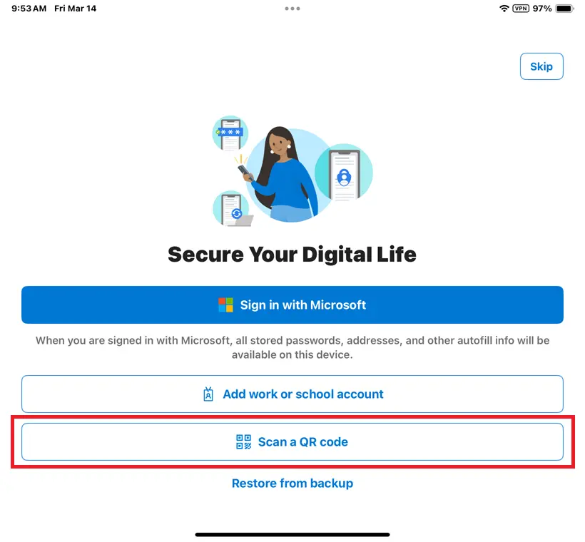 *Note: If you selected Skip on the first screen, or you do not see the option to Scan a QR code, please tap Add account or press the plus-sign (+) on the top corner. You may then choose Work or school account. Here you will be presented with the Scan QR code option.