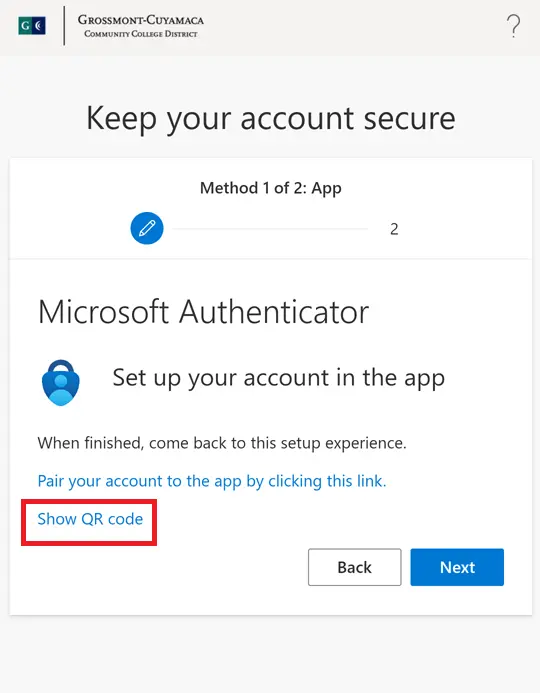 This guide will walk users through an alternate method to set up the Microsoft Authenticator app. This is required to access GCCCD resources away from campus. You will need two separate devices to complete this procedure - a laptop or desktop computer, as well as your smartphone.
